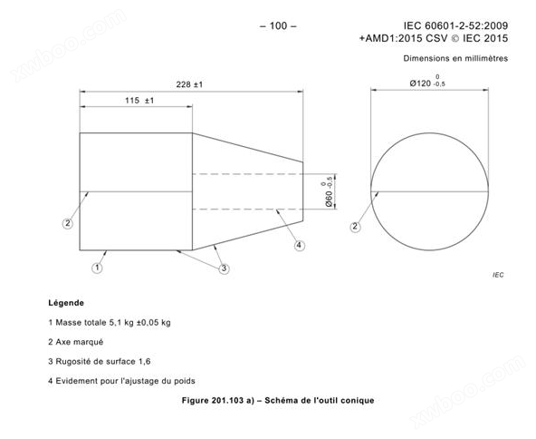 主要參數(shù)規(guī)格:卡陷試驗(yàn)工具錐形工具是根據(jù)醫(yī)用病床標(biāo)準(zhǔn)IEC60601-2-52圖201.103a設(shè)計(jì)而成,本錐形試驗(yàn)工具材質(zhì)為45#鋼,重量5.1±0.05kg。